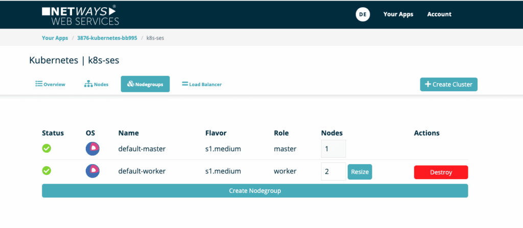 Im ersten Bild sieht man unseren exemplarischen Kubernetes Cluster „k8s-ses“. Dieser verfügt aktuell über zwei Nodegroups: „default-master“ und „default-worker“.