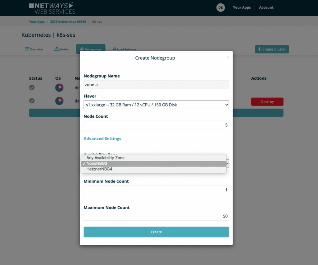 Nodegroups eignen sich, um Pods gezielt auf bestimmten Nodes auszuführen. Es ist zum Beispiel möglich, eine Gruppe mit dem „Availability-Zone“-Attribut zu definieren. Neben der bereits bestehenden „default-nodegroup“, die die Nodes relativ willkürlich über alle Verfügbarkeitszonen verteilt, können weitere Nodegroups erstellt werden, die jeweils nur in einer Verfügbarkeitszone explizit gestartet werden. Innerhalb des Kubernetes Clusters kann man seine Pods in die entsprechenden Verfügbarkeitszonen bzw. Node-Gruppen aufteilen. Ein weiteres mögliches Szenario ist es, seine Nodegroups nach schnellen und langsameren VMs einzuteilen. Services und Anwendungen, die keine besonderen Ansprüche erheben, können der langsameren und somit meist auch günstigeren Nodegroup zugewiesen werden, während Pods mit mehr Anspruch ausschließlich auf schnellen Nodes betrieben werden. Der eigenen Fantasie und den eigenen Voraussetzungen wird durch die gewonnene Flexibilität Genüge getan. Neue Nodegroups lassen sich bequem über das NWS Web-Interface anlegen:
