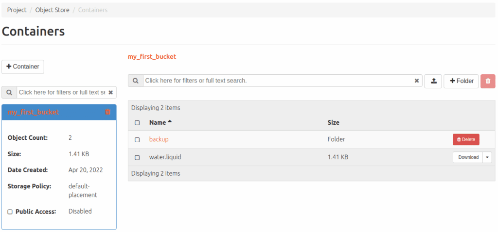 Natürlich gibt es noch sehr viel mehr Parameter für den s3cmd, all diese lassen sich mittels –help auflisten. Bei der Verwendung von s3 lassen sich aber auch moderne und elegante Verfahrensweisen gleich mit einbauen, z. B. die Lebensdauer einer Datei mit vorab festgelegtem Löschdatum. In der Cloud kann man sich auch ansehen, was das Objectstorage so tut, dafür navigiert man über Projekt>Objektspeicher zum entsprechenden Menü.