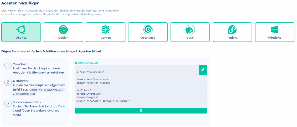 Diese lädt man einfach nach Anleitung auf den Server, führt es aus und schon ist der Server an den Icinga2 Master angebunden.