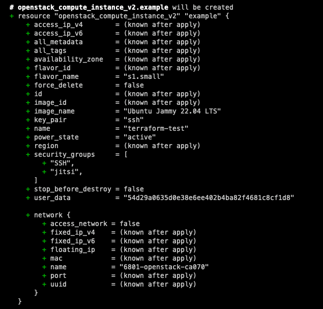 terraform initDies ist erforderlich, da Terraform – obwohl wir es bereits installiert haben – nicht den Code für alle Provider sammelt. Das übernehmen wir an der Stelle, um alle Informationen zu bekommen, die wir für OpenStack benötigen. Anschließend sind wir in der Lage, mit unserem Projekt zu kommunizieren. Jetzt können wir damit beginnen, eine Infrastruktur aufzubauen und unsere Ressourcen zum Laufen zu bringen! Für dieses Beispiel werden wir einen Server mit einem Standard-Flavour und einem SSH-Schlüssel starten. Hier ist meine Konfiguration für beide Ressourcen: