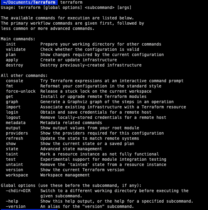 brew install hashicorp/tap/terraformSomit wird das Repository und alles, was sonst benötigt wird, installiert. Anschließend stellen wir sicher, dass das Setup funktionsfähig ist. Indem man „terraform“ in die Konsole eingibt, kann man prüfen, ob man eine Antwort erhält.