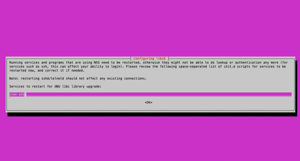 In den nächsten Schritten wirst du aufgefordert, die Installation aller neuen Pakete für die neue Distribution zu bestätigen. Natürlich wollen wir damit fortfahren, also stimmst du einfach auch den nächsten beiden Bildschirmen zu. Der erste fragt, ob Neustarts erlaubt sind. Falls du ein Dist-Upgrade durchführen, ist dein Server ohnehin nicht erreichbar. Es ist also irrelevant, ob du neu startest oder nicht, drücke einfach die Eingabetaste, um den Prozess fortzusetzen.