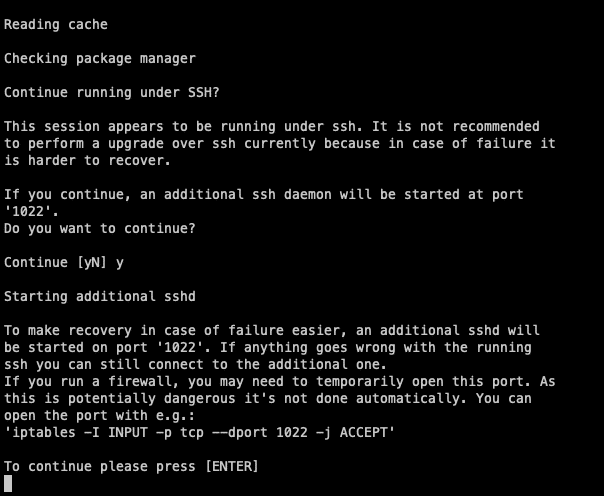 Da wir dies wahrscheinlich über SSH machen werden, wird der Assistent dich fragen, ob du einen Daemon auf Port 1022 laufen lassen willst, falls während des Prozesses etwas abstürzt. Akzeptiere diese Frage immer mit ja, da du dann die Instanz über diesen Port wiederherstellen und den Prozess fortsetzen kannst. Vergewissere dich, dass dieser Port auf deinem Rechner oder deiner Firewall frei ist, falls du dies nicht bereits getan haben. Danach drückst du einfach die Eingabetaste, um fortzufahren.