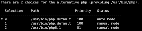 a2enmod php8.1Mit diesem Befehl können wir auch die Standard-PHP-Version festlegen, die immer verwendet wird, wenn nichts anderes angegeben ist. Wir haben die Möglichkeit, sie entweder als Standard zu belassen oder zu erzwingen, dass sie immer die von uns ausgewählte Version bevorzugt. Dies wirkt sich jedoch nur auf die PHP-Befehle aus, die sie in der CLI verwenden, und ist nicht anwendungsspezifisch.