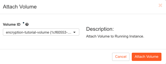 Ein weiterer Popupdialog öffnet sich, und bietet verfügbare Volumes zum Einbinden an. Wähle das im vorherigen Schritt erstellte LUKS verschlüsselte Volume und bestätige mit einem Klick auf Attach Volume: