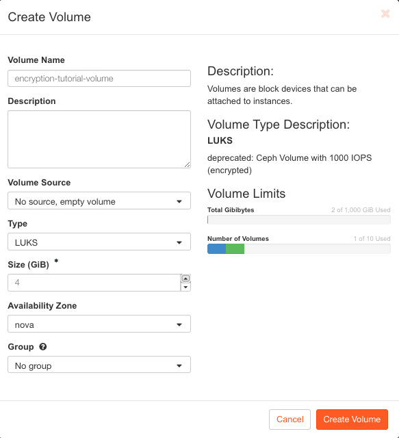 In obigem Screenshot Screenshot ist das Volume für den Typ LUKS konfiguriert, was der Volumetyp für LUKS verschlüsselten Speicher auf NWS OpenStack ist. Ich habe außerdem sichergestellt, dass ein neues, leeres Volume erstellt wird, und die Größe auf 4GB gesetzt.