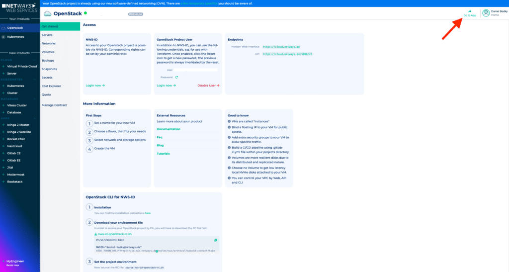 Zuerst schauen wir uns an, wie LUKS verschlüsselter Speicher auf OpenStack über Horizon, OpenStacks Weboberfläche, bereitgestellt werden kann. Wenn du ein NWS-Kunde bist, kannst du Horizon entweder über https://cloud.netways.de erreichen und dich mit deiner NWS ID einloggen, oder du klickst in deiner Projektübersicht auf MyNWS auf den „Go to App“ Button oben rechts.