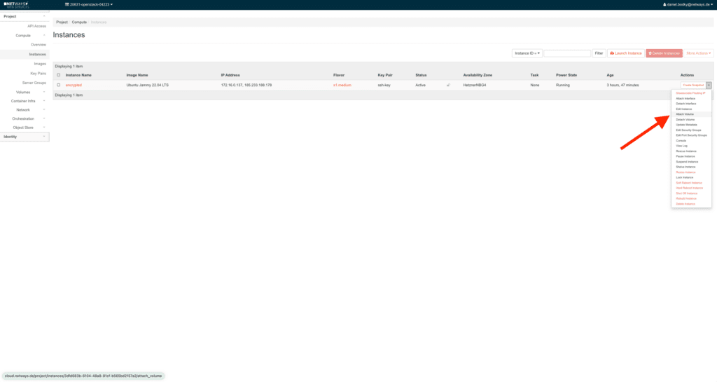 Sobald der Server läuft, können wir das verschlüsselte Volume in Horizon einbinden: Klappe das Dropdownmenü in der Action Spalte der Serverübersicht aus, und wähle Attach Volume von den verfügbaren Aktionen.
