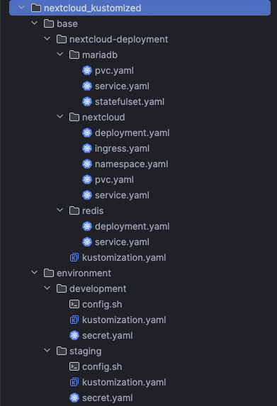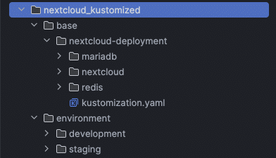 nextcloud_kustomized/environment/developmentkubectl apply erzeugt das endgültige Manifest und wendet es auf den Cluster an. Wenn es irgendwelche Probleme gibt, weist Kustomize darauf hin.