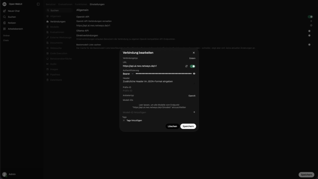 Im Admin-Bereich unter Einstellungen -> Verbindungen -> OpenAI-API kannst du die Verbidnung zur OpenAI-kompatiblen API festlegen.