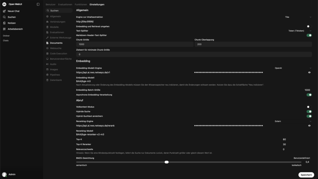 – Reranking-Engine: Im Dropdown Extern auswählen, dann die URL https://api.ai.nws.netways.de/rerank setzen und den API-Key hinterlegen